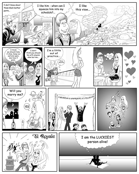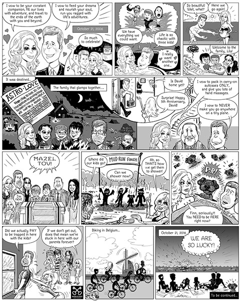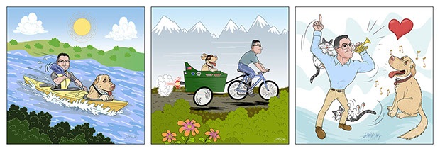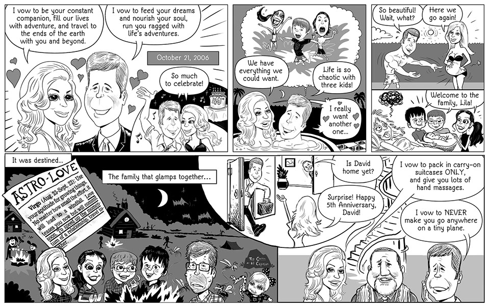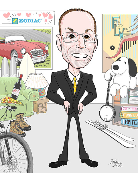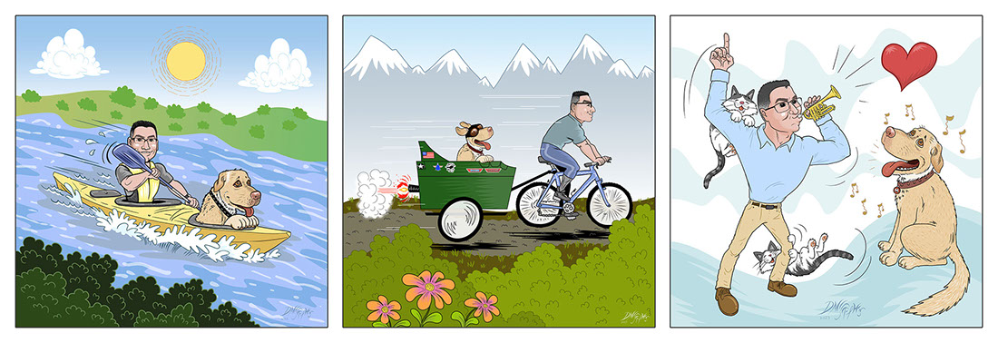 Gift caricatures and personal commissions are not quick sketches but custom contemporary art to be framed and shared with family, friends and clients for years to come. Clients can choose to order a simple portrait or avatar for social media or business cards, or they can commission an elaborate illustration that shows one or dozens of people in a humorous situation with a detailed background.