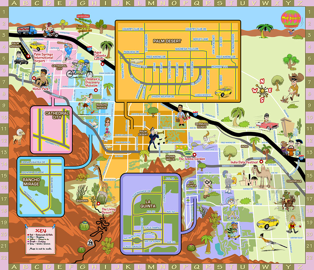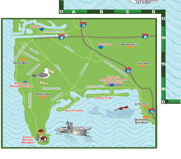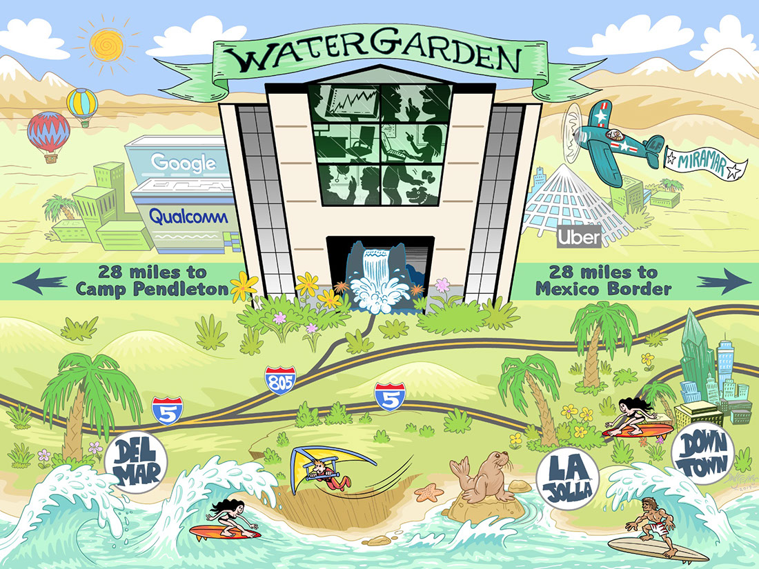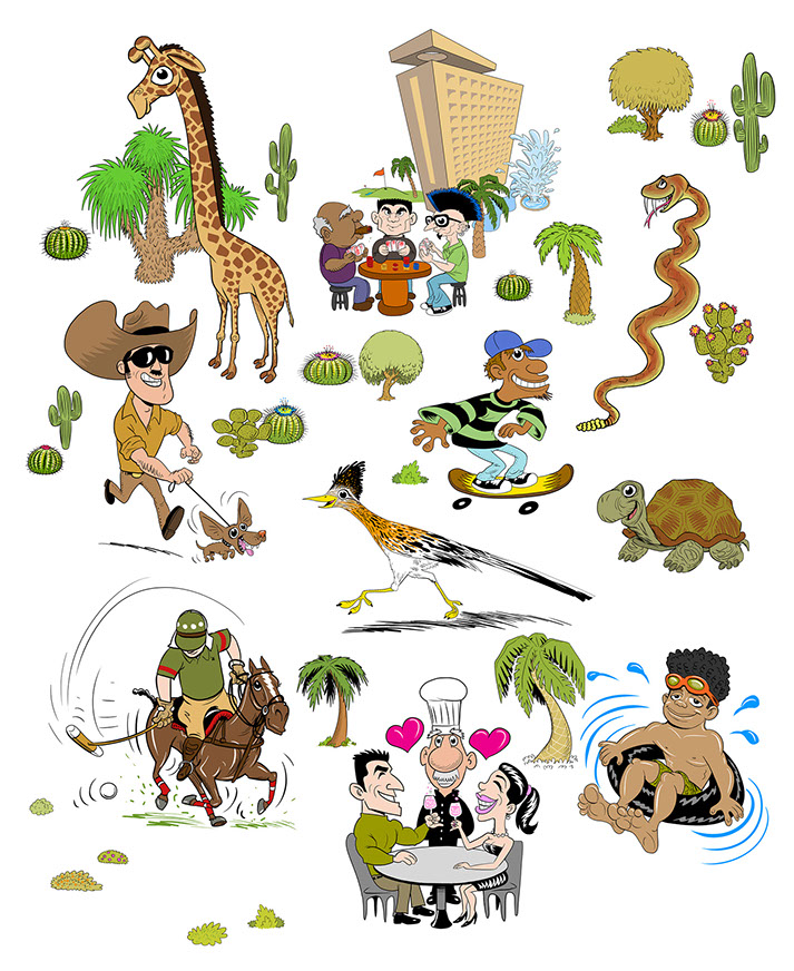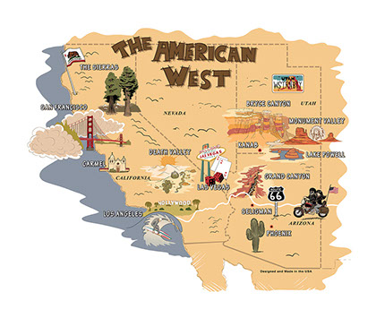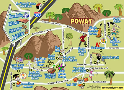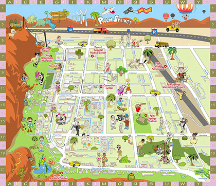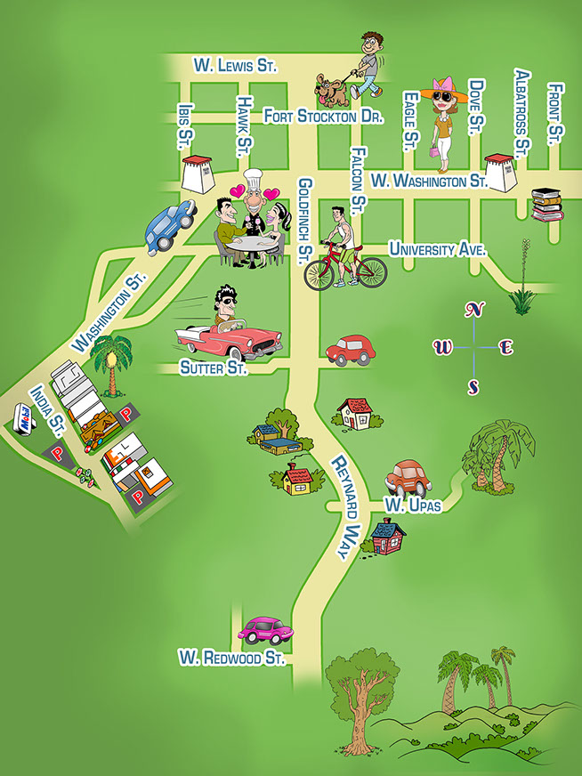 Cartoon maps can serve many purposes: locate your businesses for clients or advertisers, demonstrate the scope of purpose of your brand, enhance your event planning and guest experiences with an event-specific map, illustrate a life geographically using locations from a person's past (e.g. birth, schools, hobbies, homes, favorite places to eat/visit, college, first job, wedding location, retirement, etc.), or show a love story or courtships geographically (e.g. first date, proposal, guests' hotel sites, rehearsal dinner location, wedding site, first shared home, major sites/attractions around town for out-of-town guests, etc.).