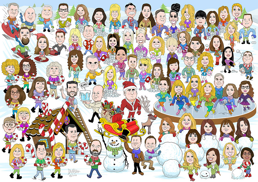 Gift caricatures and personal commissions are not quick sketches but custom contemporary art to be framed and shared with family, friends and clients for years to come. Clients can choose to order a simple portrait or avatar for social media or business cards, or they can commission an elaborate illustration that shows one or dozens of people in a humorous situation with a detailed background.